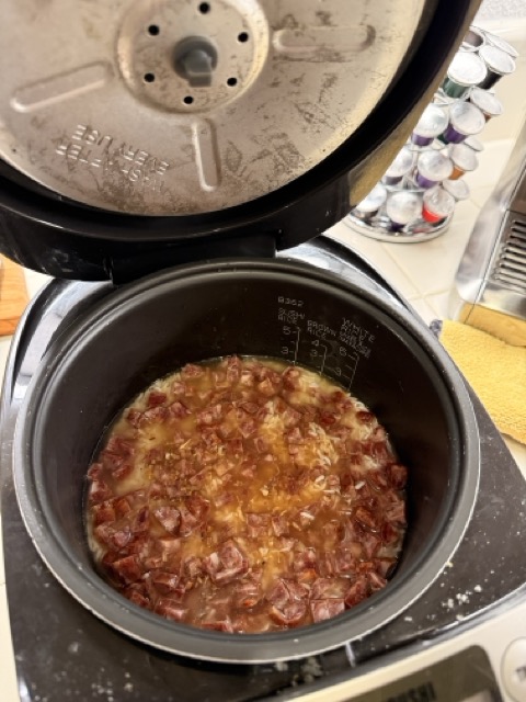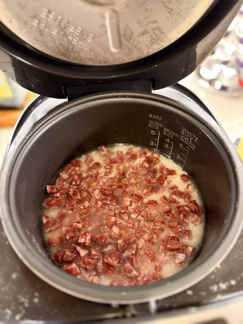• Then place the sausage and dried shrimp directly on top of the rice so the flavors infuse into every grain while cooking. Press the "Cook" button.