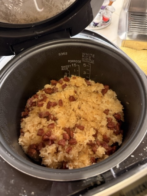 • Once the rice is cooked, use chopsticks to fluff it up and mix the sausage and shrimp evenly.